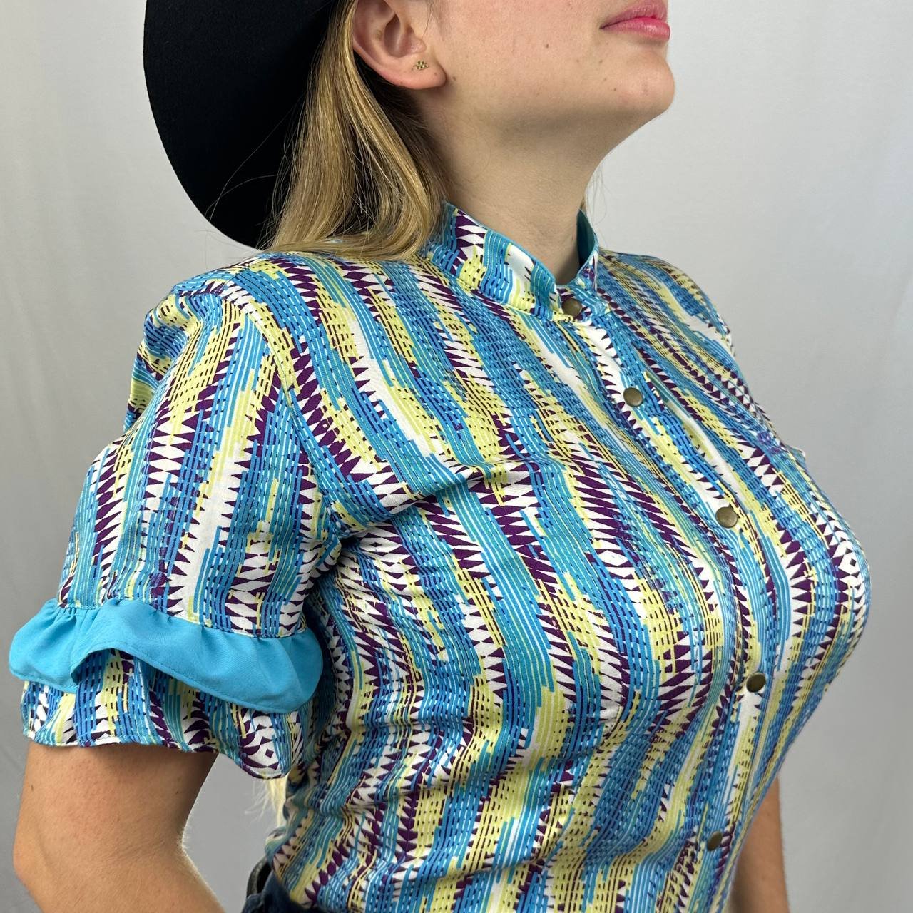 La prenda está completamente cubierta por un espectacular estampado geométrico de inspiración tribal, en una alegre paleta de colores donde se mezclan los azules, amarillos y tonos tierra. Su detalle más original se encuentra en las mangas cortas, adornadas con un bolero o volante que les aporta un toque de volumen y un acabado de diseño inesperado y muy chic.