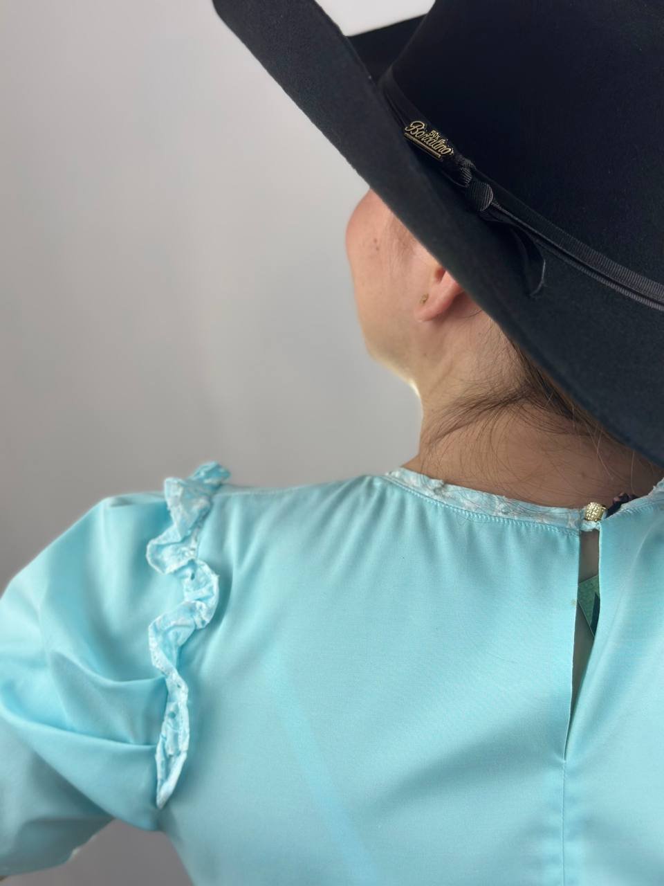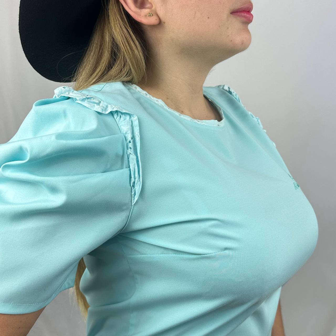 El diseño presenta una silueta limpia y minimalista en un precioso y sereno color azul celeste. El centro de atención son sus mangas, que gracias a un delicado fruncido en los hombros crean un elegante efecto abullonado. Es una prenda que demuestra que no se necesita mucho para tener un gran estilo.