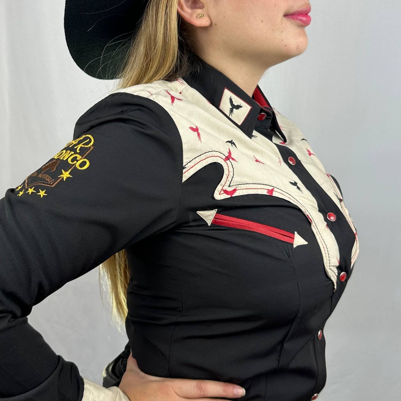 Luce un auténtico estilo western con la camisa ‘Sofired’. Un impactante diseño negro para mujer que contrasta con un yugo estampado y audaces detalles en rojo vivo. La prenda perfecta para un look vaquero con carácter, fuerza y tradición