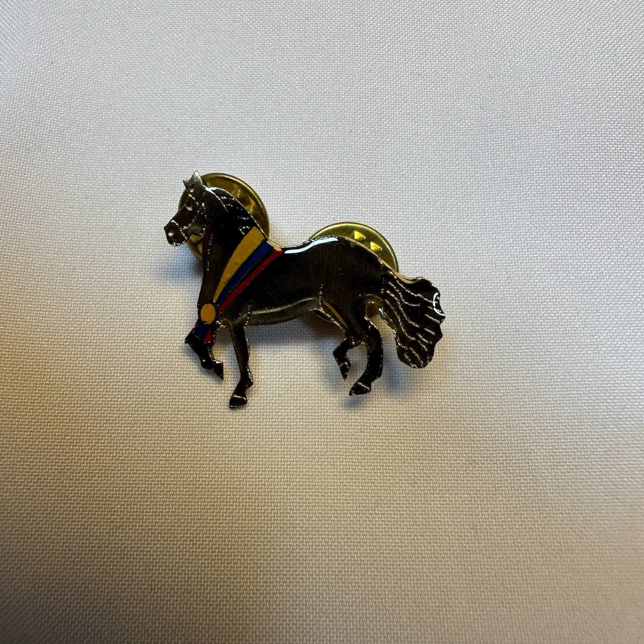Pin metálico negro con figura de caballo y un distintivo detalle tricolor (amarillo, azul y rojo). Un homenaje a la cultura ecuestre colombiana.