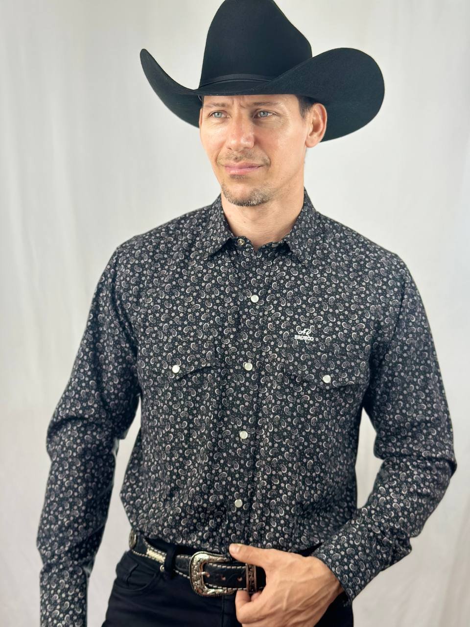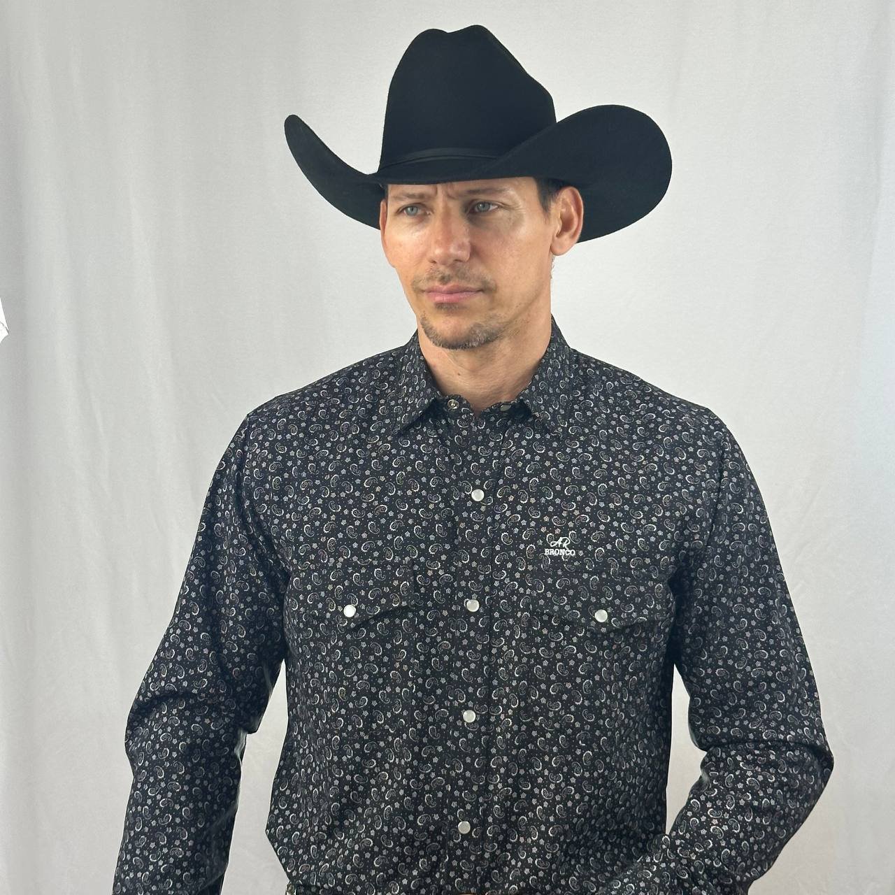 El diseño presenta una base en un profundo y siempre elegante color negro, sobre la cual se distribuye un fino y detallado estampado de arabescos en color blanco. Este patrón de inspiración oriental le da un carácter único y muy distinguido a la prenda. Su corte de manga larga y sus prácticos bolsillos tipo parche en el pecho mantienen la funcionalidad y el estilo atemporal.